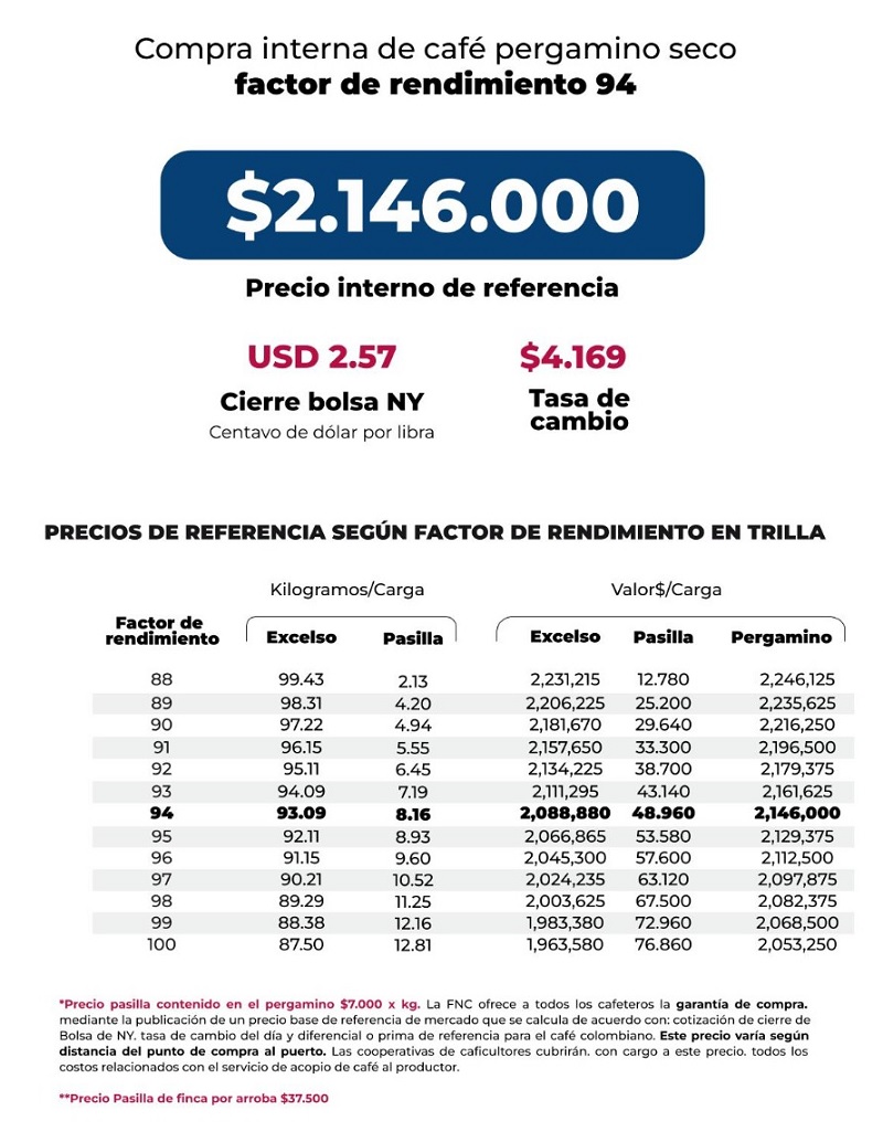 (FNC – Viernes 4 de octubre de 2024).- La Federación Nacional de Cafeteros de Colombia (FNC) ofrece a todos los cafeteros la Garantía de Compra, mediante la publicación de un precio base de mercado que se calcula de acuerdo con la cotización de cierre en la Bolsa de Nueva York del día, el precio del dólar del día y el diferencial o prima de referencia para el café colombiano.