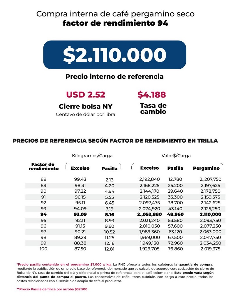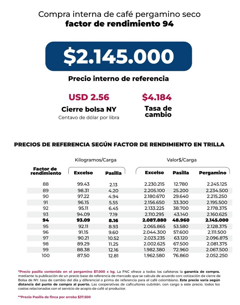 (FNC – Jueves 3 de octubre de 2024).- La Federación Nacional de Cafeteros de Colombia (FNC) ofrece a todos los cafeteros la Garantía de Compra, mediante la publicación de un precio base de mercado que se calcula de acuerdo con la cotización de cierre en la Bolsa de Nueva York del día, el precio del dólar del día y el diferencial o prima de referencia para el café colombiano.