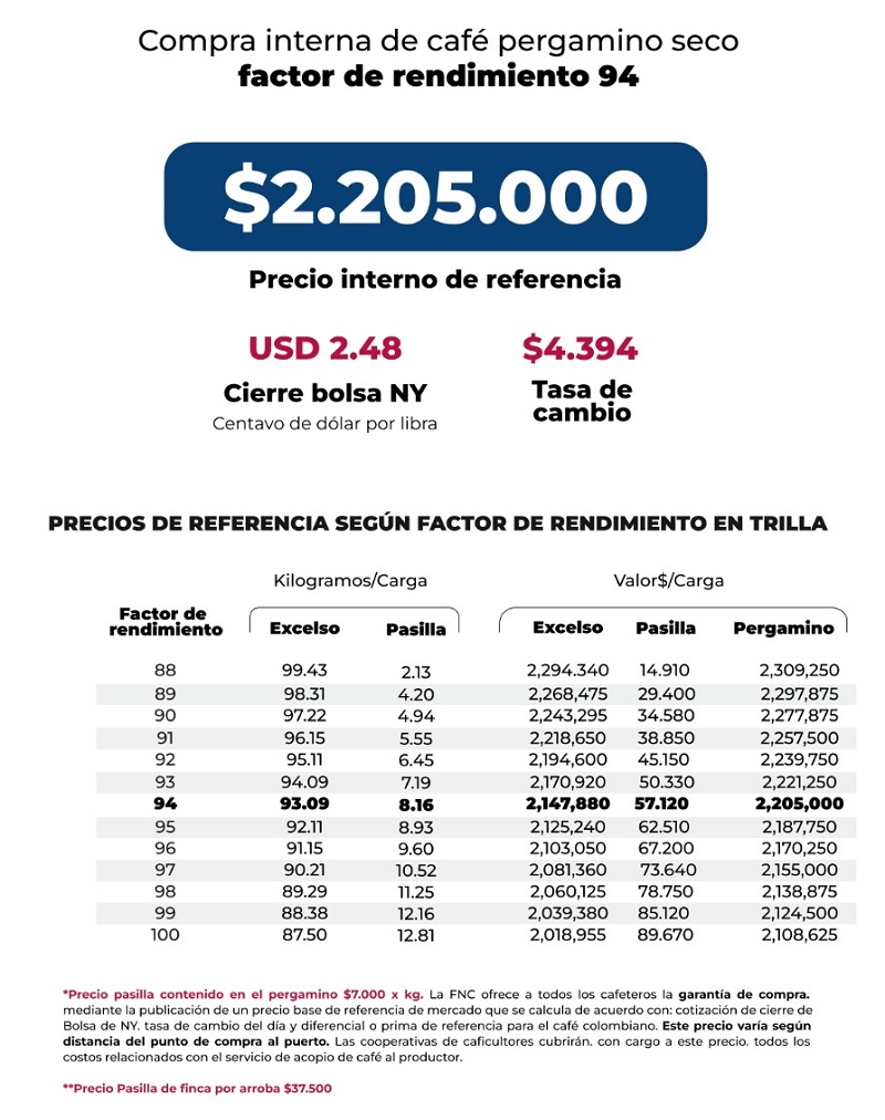 (FNC – Martes 29 de octubre de 2024).- La Federación Nacional de Cafeteros de Colombia (FNC) ofrece a todos los cafeteros la Garantía de Compra, mediante la publicación de un precio base de mercado que se calcula de acuerdo con la cotización de cierre en la Bolsa de Nueva York del día, el precio del dólar del día y el diferencial o prima de referencia para el café colombiano.