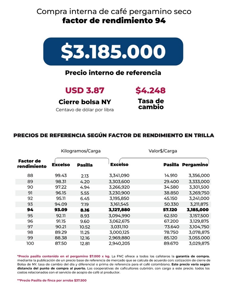 (FNC – Jueves 8 de mayo de 2025).- La Federación Nacional de Cafeteros de Colombia (FNC) ofrece a todos los cafeteros la Garantía de Compra, mediante la publicación de un precio base de mercado que se calcula de acuerdo con la cotización de cierre en la Bolsa de Nueva York del día, el precio del dólar del día y el diferencial o prima de referencia para el café colombiano.