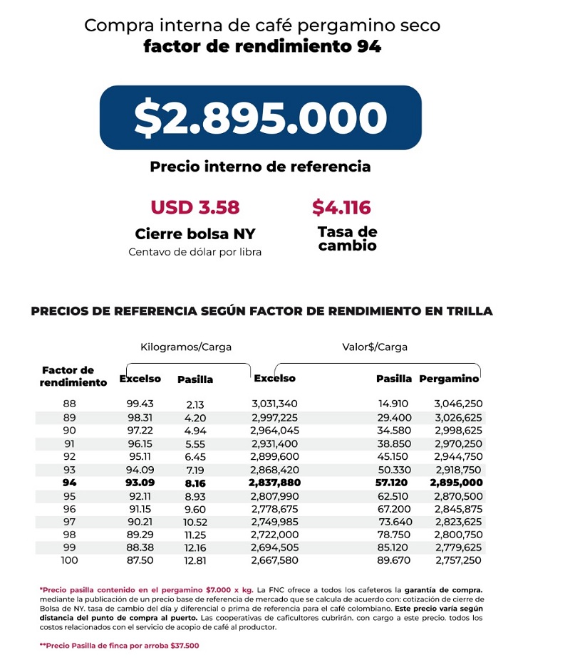 (FNC – Viernes 6 de junio de 2025).- La Federación Nacional de Cafeteros de Colombia (FNC) ofrece a todos los cafeteros la Garantía de Compra, mediante la publicación de un precio base de mercado que se calcula de acuerdo con la cotización de cierre en la Bolsa de Nueva York del día, el precio del dólar del día y el diferencial o prima de referencia para el café colombiano.