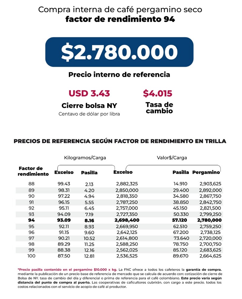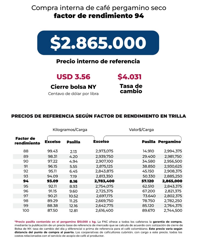 (FNC – Lunes 18 de agosto de 2025).- La Federación Nacional de Cafeteros de Colombia (FNC) ofrece a todos los cafeteros la Garantía de Compra, mediante la publicación de un precio base de mercado que se calcula de acuerdo con la cotización de cierre en la Bolsa de Nueva York del día, el precio del dólar del día y el diferencial o prima de referencia para el café colombiano.