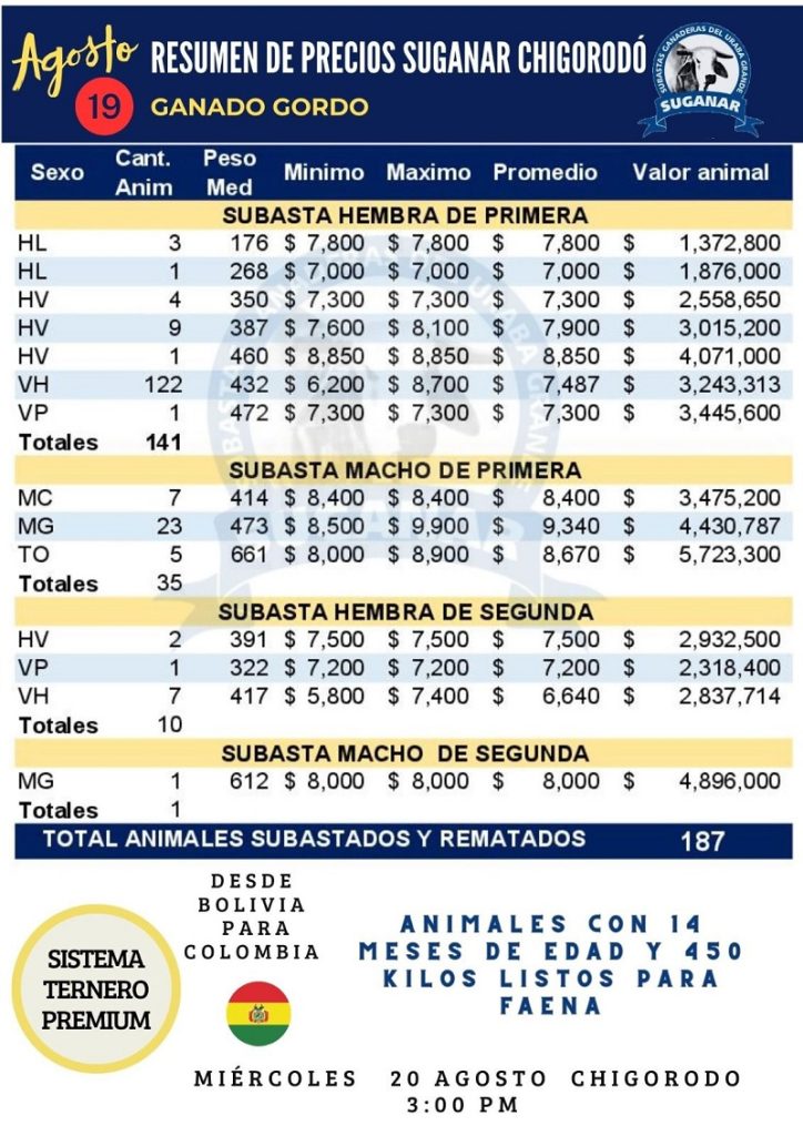 (Suganar – Miércoles 20 de agosto de 2025).- Las Subastas Ganaderas del Urabá Grande (Suganar) presentan el resumen de precios por kilo del Ganado Gordo en Chigorodó (Uraba).