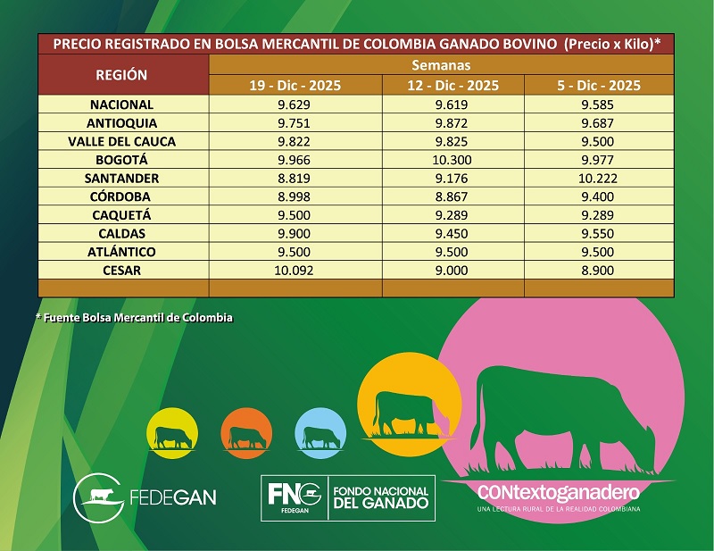 (Fedegán, BMC – Lunes 22 de diciembre de 2025).- Presentamos la tabla de precios indicativos de ganado bovino comercial (Ganado macho gordo) en nueve departamentos del país, suministrados por Fedegán y la Bolsa Mercantil de Colombia.