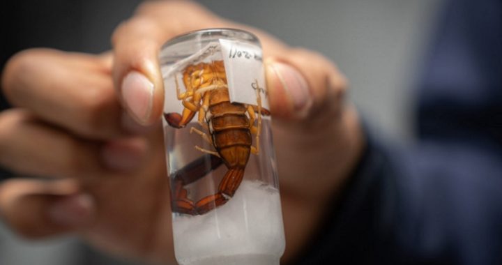 * Escorpión de la familia Buthidae. Holotipo de la especie Centruroides sanandres. Foto Cortesía: María Fernanda Londoño de la Hoz (Unimedios).