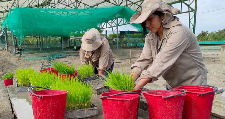 * En la foto, personal técnico de las dos organizaciones preparando las plántulas de arroz editadas para su establecimiento en ensayos de campo confinado.