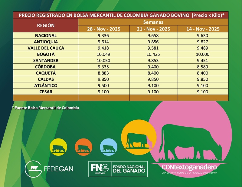 (Fedegán, BMC – Martes 2 de diciembre de 2025).- Presentamos la tabla de precios indicativos de ganado bovino comercial (Ganado macho gordo) en nueve departamentos del país, suministrados por Fedegán y la Bolsa Mercantil de Colombia.