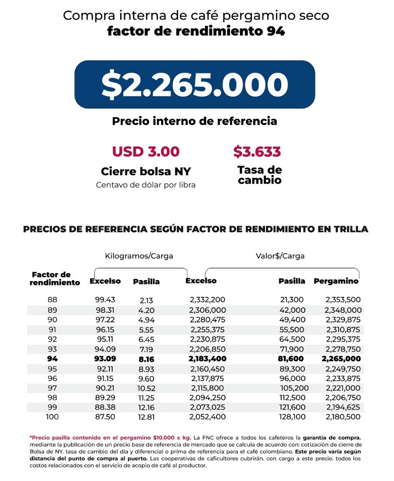 (FNC – Martes 14 de abril de 2026).- La Federación Nacional de Cafeteros de Colombia (FNC) ofrece a todos los cafeteros la Garantía de Compra, mediante la publicación de un precio base de mercado que se calcula de acuerdo con la cotización de cierre en la Bolsa de Nueva York del día, el precio del dólar del día y el diferencial o prima de referencia para el café colombiano.