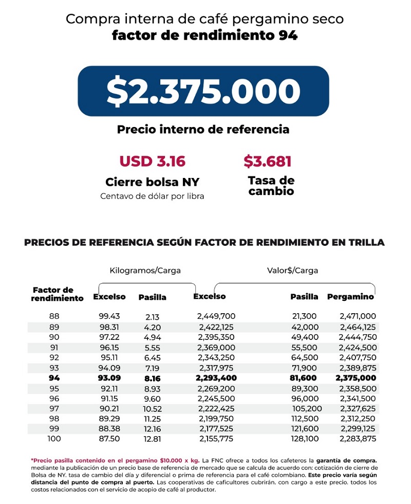 (FNC – Miércoles 25 de marzo de 2026).- La Federación Nacional de Cafeteros de Colombia (FNC) ofrece a todos los cafeteros la Garantía de Compra, mediante la publicación de un precio base de mercado que se calcula de acuerdo con la cotización de cierre en la Bolsa de Nueva York del día, el precio del dólar del día y el diferencial o prima de referencia para el café colombiano.