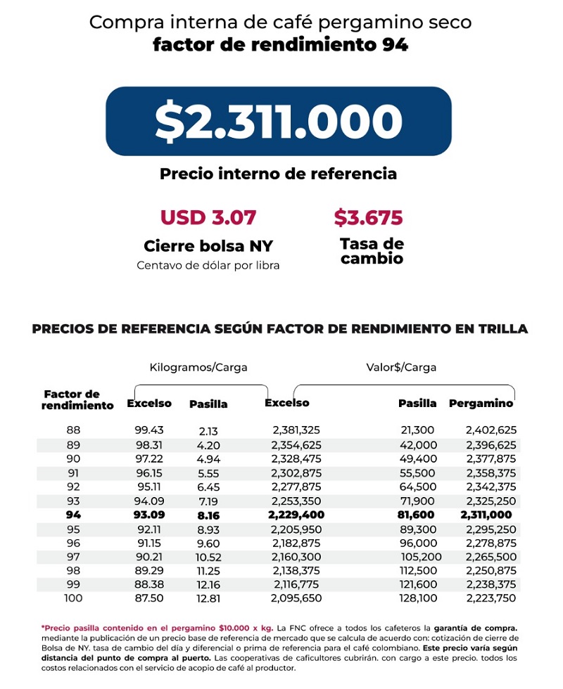 (FNC – Jueves 26 de marzo de 2026).- La Federación Nacional de Cafeteros de Colombia (FNC) ofrece a todos los cafeteros la Garantía de Compra, mediante la publicación de un precio base de mercado que se calcula de acuerdo con la cotización de cierre en la Bolsa de Nueva York del día, el precio del dólar del día y el diferencial o prima de referencia para el café colombiano.