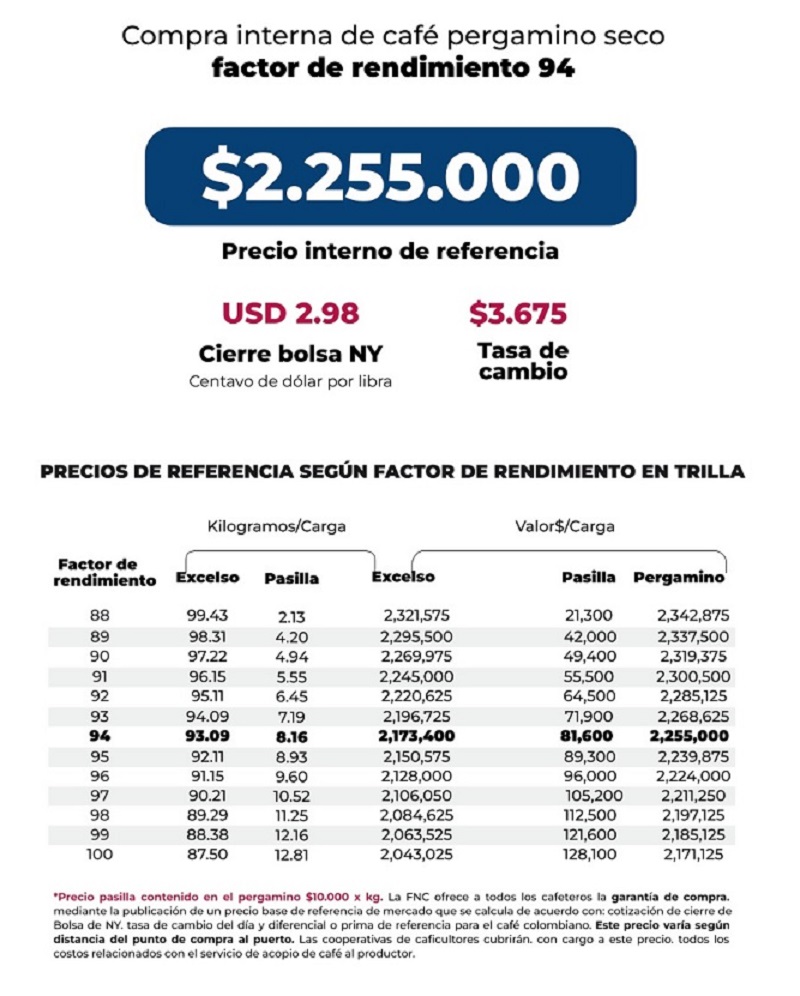(FNC – Martes 31 de marzo de 2026).- La Federación Nacional de Cafeteros de Colombia (FNC) ofrece a todos los cafeteros la Garantía de Compra, mediante la publicación de un precio base de mercado que se calcula de acuerdo con la cotización de cierre en la Bolsa de Nueva York del día, el precio del dólar del día y el diferencial o prima de referencia para el café colombiano.