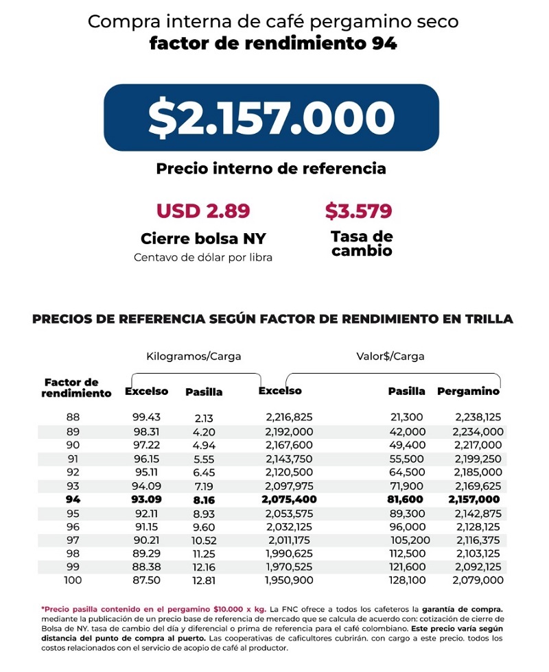 (FNC – Martes 21 de abril de 2026).- La Federación Nacional de Cafeteros de Colombia (FNC) ofrece a todos los cafeteros la Garantía de Compra, mediante la publicación de un precio base de mercado que se calcula de acuerdo con la cotización de cierre en la Bolsa de Nueva York del día, el precio del dólar del día y el diferencial o prima de referencia para el café colombiano.