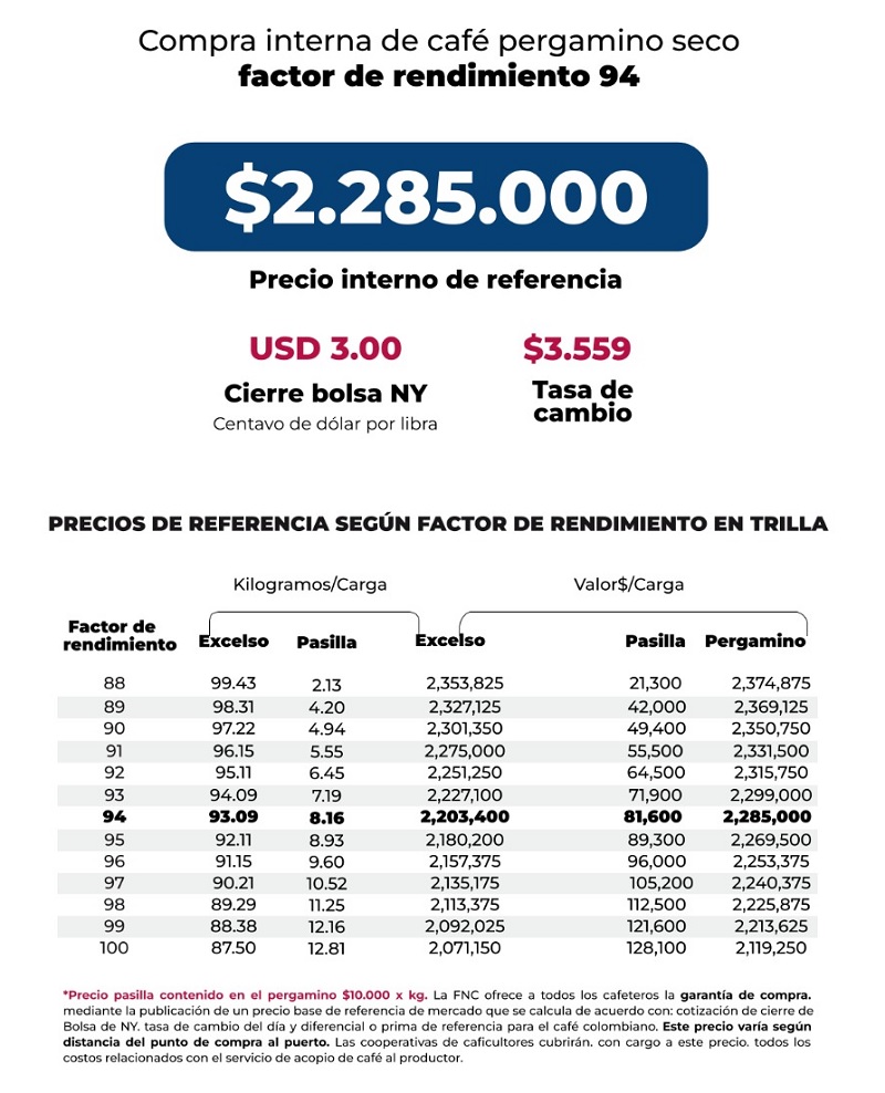 (FNC – Jueves 23 de abril de 2026).- La Federación Nacional de Cafeteros de Colombia (FNC) ofrece a todos los cafeteros la Garantía de Compra, mediante la publicación de un precio base de mercado que se calcula de acuerdo con la cotización de cierre en la Bolsa de Nueva York del día, el precio del dólar del día y el diferencial o prima de referencia para el café colombiano.