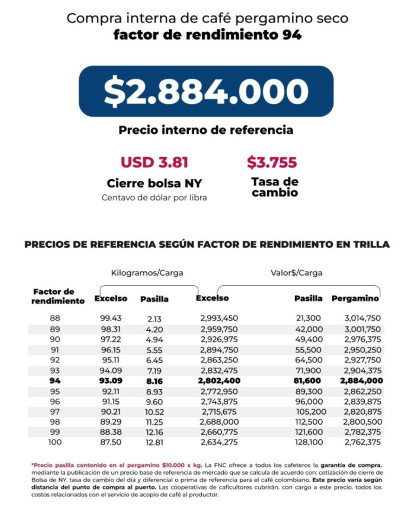 (FNC – Viernes 28 de noviembre de 2025).- La Federación Nacional de Cafeteros de Colombia (FNC) ofrece a todos los cafeteros la Garantía de Compra, mediante la publicación de un precio base de mercado que se calcula de acuerdo con la cotización de cierre en la Bolsa de Nueva York del día, el precio del dólar del día y el diferencial o prima de referencia para el café colombiano.
