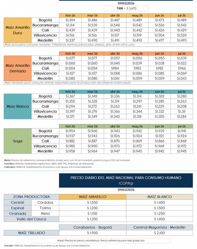 (Fenalce – Lunes 9 de febrero de 2026).- A continuación encontrará los precios futuros de maíz y soya para Colombia. Estos son precios referencia no necesariamente son precios de compra. Los precios de cada comprador pueden variar al precio referencia dependiendo de condiciones pasadas, presentes y/o futuras del mercado internacional y/o nacional. Estos valores de se dan en pesos colombianos, de acuerdo con los precios de la Bolsa de Chicago y con la tasa de cambio del dólar americano de apertura de la jornada.