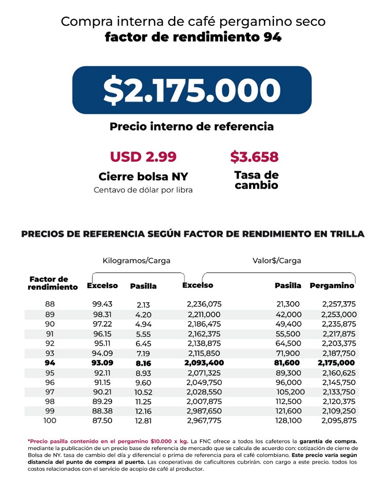 (FNC – Lunes 9 de febrero de 2026).- La Federación Nacional de Cafeteros de Colombia (FNC) ofrece a todos los cafeteros la Garantía de Compra, mediante la publicación de un precio base de mercado que se calcula de acuerdo con la cotización de cierre en la Bolsa de Nueva York del día, el precio del dólar del día y el diferencial o prima de referencia para el café colombiano.