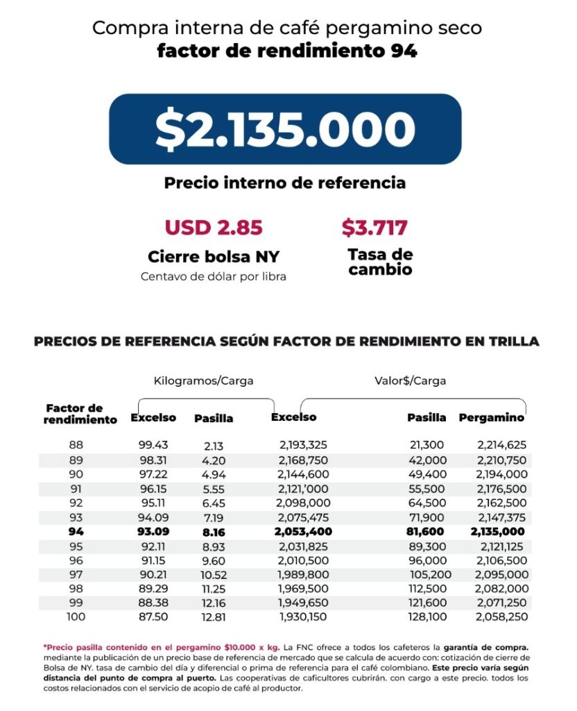 (FNC – Viernes 20 de febrero de 2026).- La Federación Nacional de Cafeteros de Colombia (FNC) ofrece a todos los cafeteros la Garantía de Compra, mediante la publicación de un precio base de mercado que se calcula de acuerdo con la cotización de cierre en la Bolsa de Nueva York del día, el precio del dólar del día y el diferencial o prima de referencia para el café colombiano.
