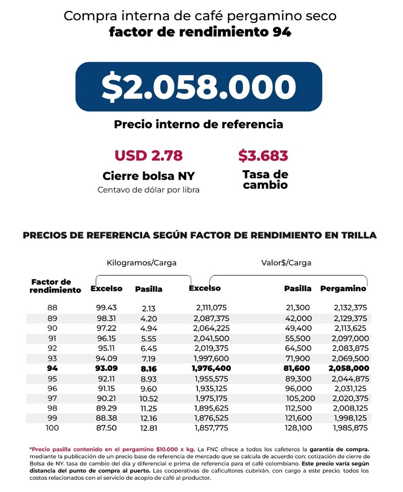 (FNC – Lunes 23 de febrero de 2026).- La Federación Nacional de Cafeteros de Colombia (FNC) ofrece a todos los cafeteros la Garantía de Compra, mediante la publicación de un precio base de mercado que se calcula de acuerdo con la cotización de cierre en la Bolsa de Nueva York del día, el precio del dólar del día y el diferencial o prima de referencia para el café colombiano.