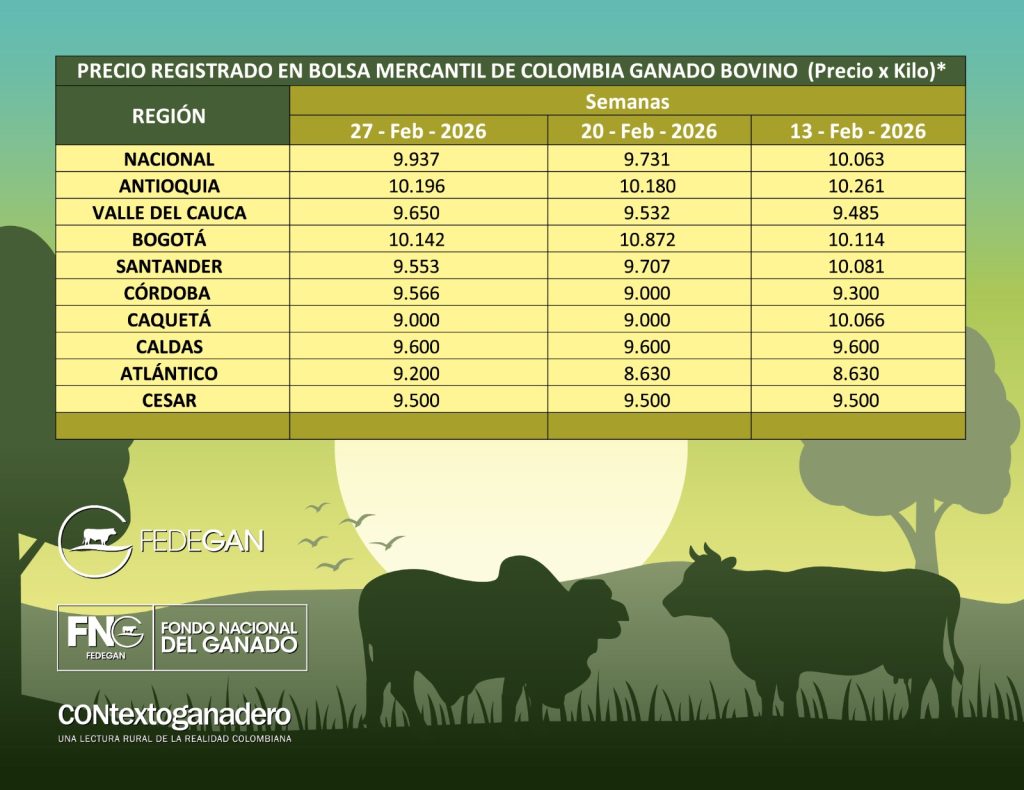 (Fedegán, BMC – Lunes 2 de marzo 2026).- Presentamos la tabla de precios indicativos de ganado bovino comercial (Ganado macho gordo) en nueve departamentos del país, suministrados por Fedegán y la Bolsa Mercantil de Colombia.