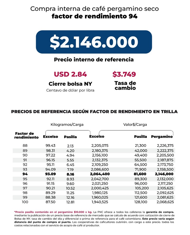 (FNC – Lunes 2 de marzo de 2026).- La Federación Nacional de Cafeteros de Colombia (FNC) ofrece a todos los cafeteros la Garantía de Compra, mediante la publicación de un precio base de mercado que se calcula de acuerdo con la cotización de cierre en la Bolsa de Nueva York del día, el precio del dólar del día y el diferencial o prima de referencia para el café colombiano.