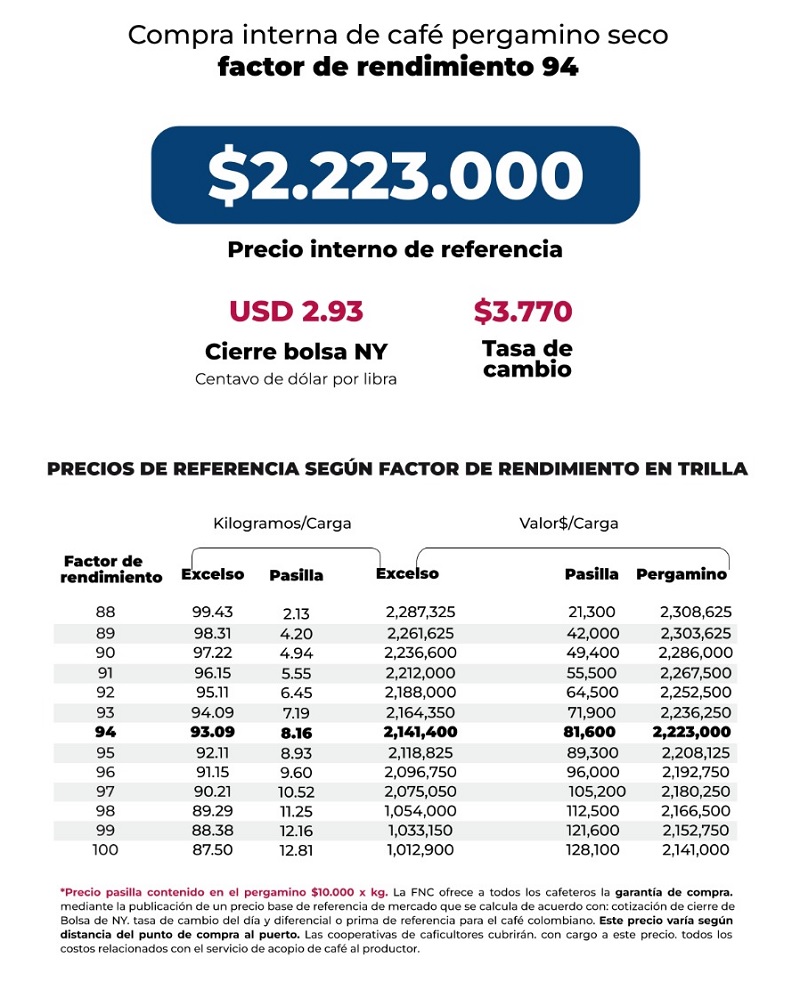 (FNC – Viernes 6 de marzo de 2026).- La Federación Nacional de Cafeteros de Colombia (FNC) ofrece a todos los cafeteros la Garantía de Compra, mediante la publicación de un precio base de mercado que se calcula de acuerdo con la cotización de cierre en la Bolsa de Nueva York del día, el precio del dólar del día y el diferencial o prima de referencia para el café colombiano.