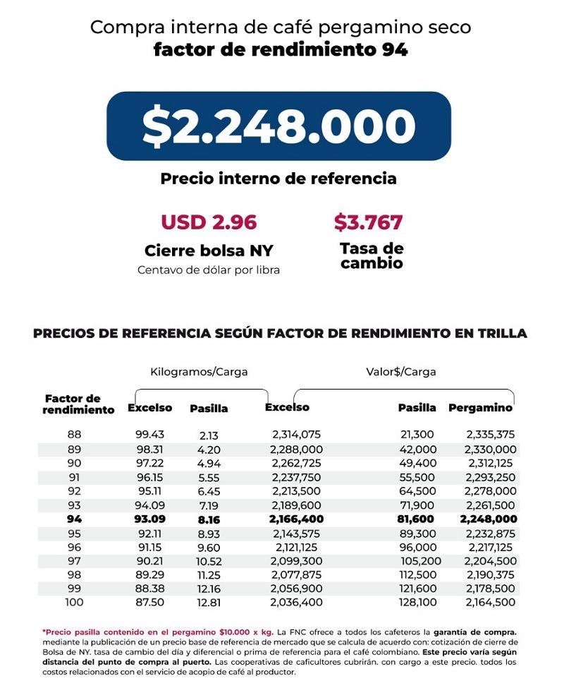(FNC – Lunes 9 de marzo de 2026).- La Federación Nacional de Cafeteros de Colombia (FNC) ofrece a todos los cafeteros la Garantía de Compra, mediante la publicación de un precio base de mercado que se calcula de acuerdo con la cotización de cierre en la Bolsa de Nueva York del día, el precio del dólar del día y el diferencial o prima de referencia para el café colombiano.