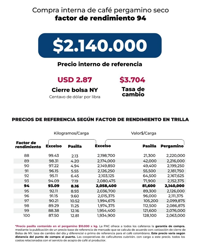 (FNC – Miércoles 11 de marzo de 2026).- La Federación Nacional de Cafeteros de Colombia (FNC) ofrece a todos los cafeteros la Garantía de Compra, mediante la publicación de un precio base de mercado que se calcula de acuerdo con la cotización de cierre en la Bolsa de Nueva York del día, el precio del dólar del día y el diferencial o prima de referencia para el café colombiano.