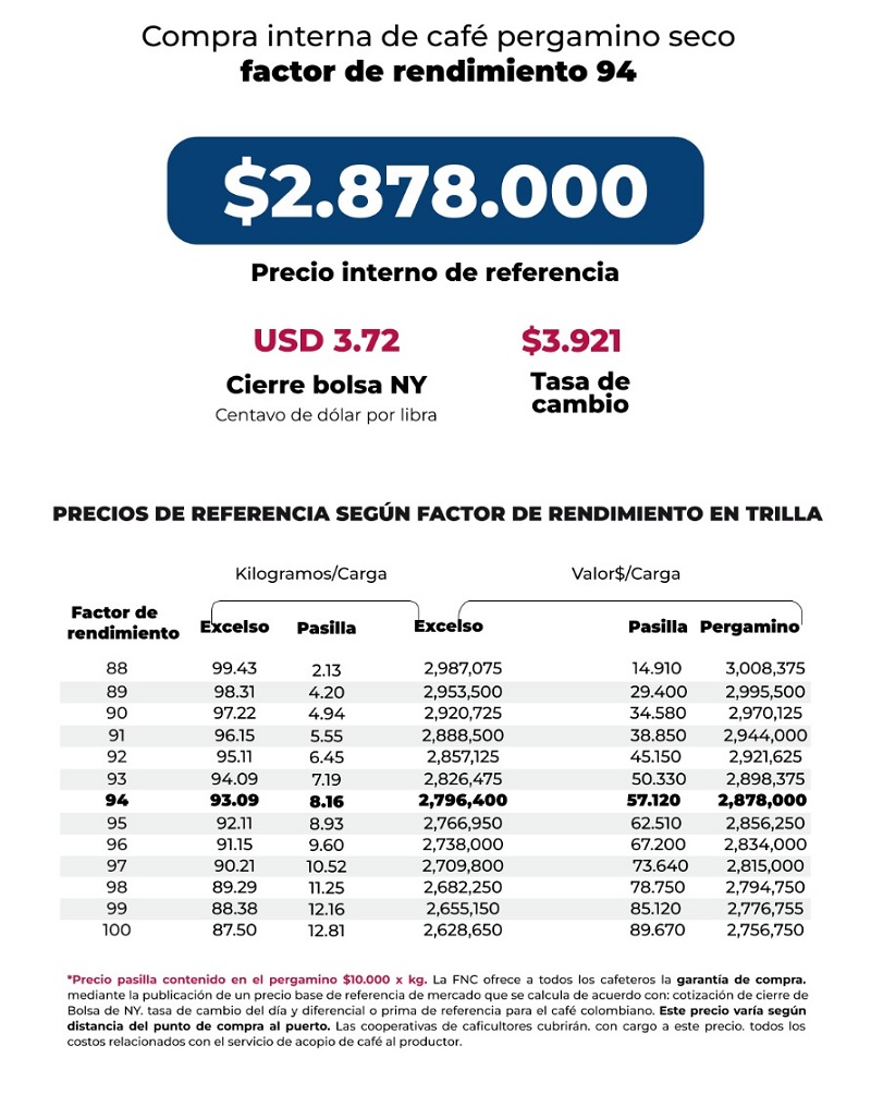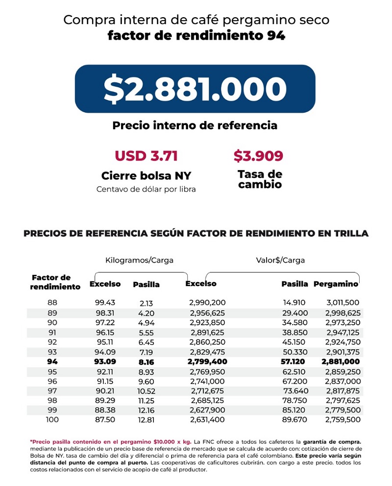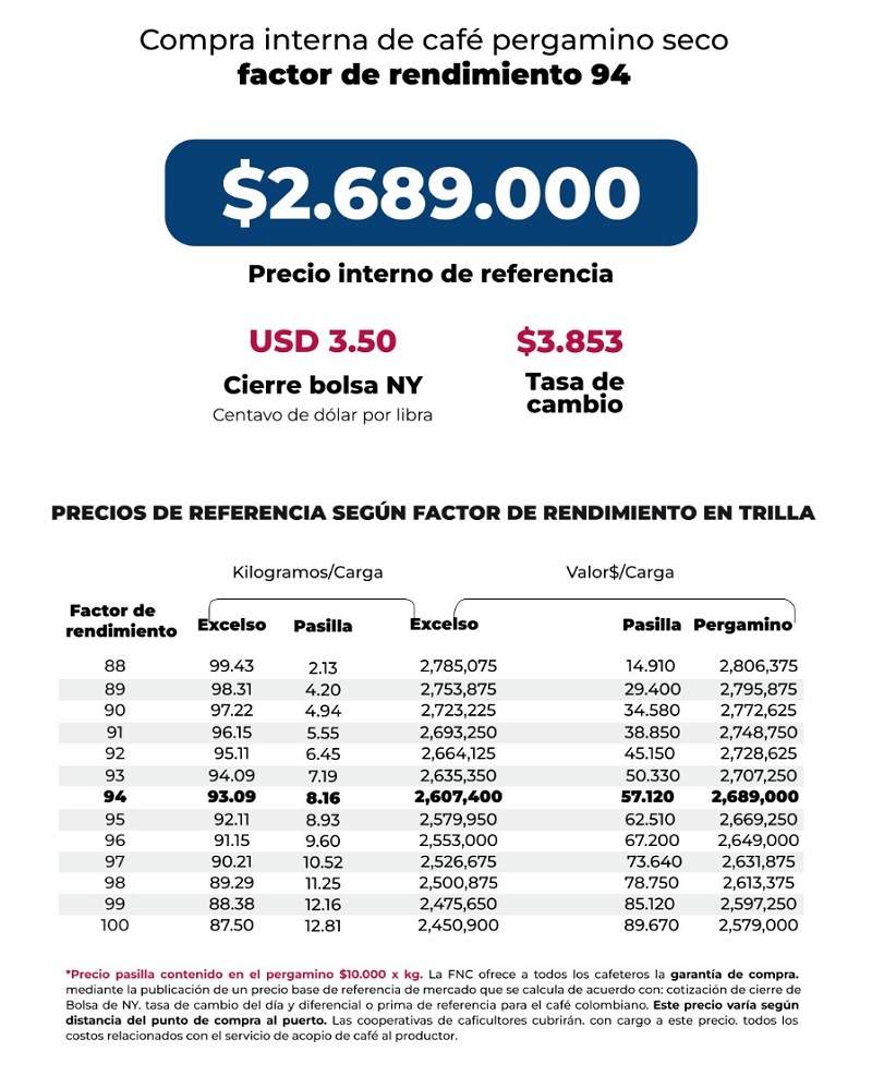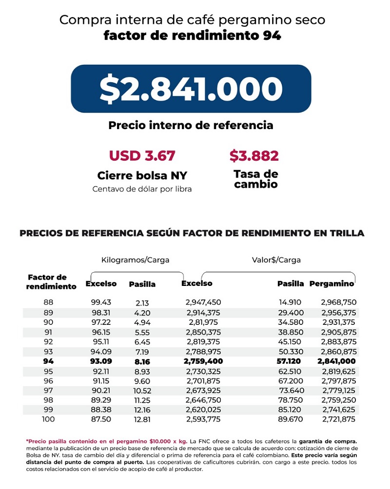 (FNC – Lunes 29 de septiembre de 2025).- La Federación Nacional de Cafeteros de Colombia (FNC) ofrece a todos los cafeteros la Garantía de Compra, mediante la publicación de un precio base de mercado que se calcula de acuerdo con la cotización de cierre en la Bolsa de Nueva York del día, el precio del dólar del día y el diferencial o prima de referencia para el café colombiano.