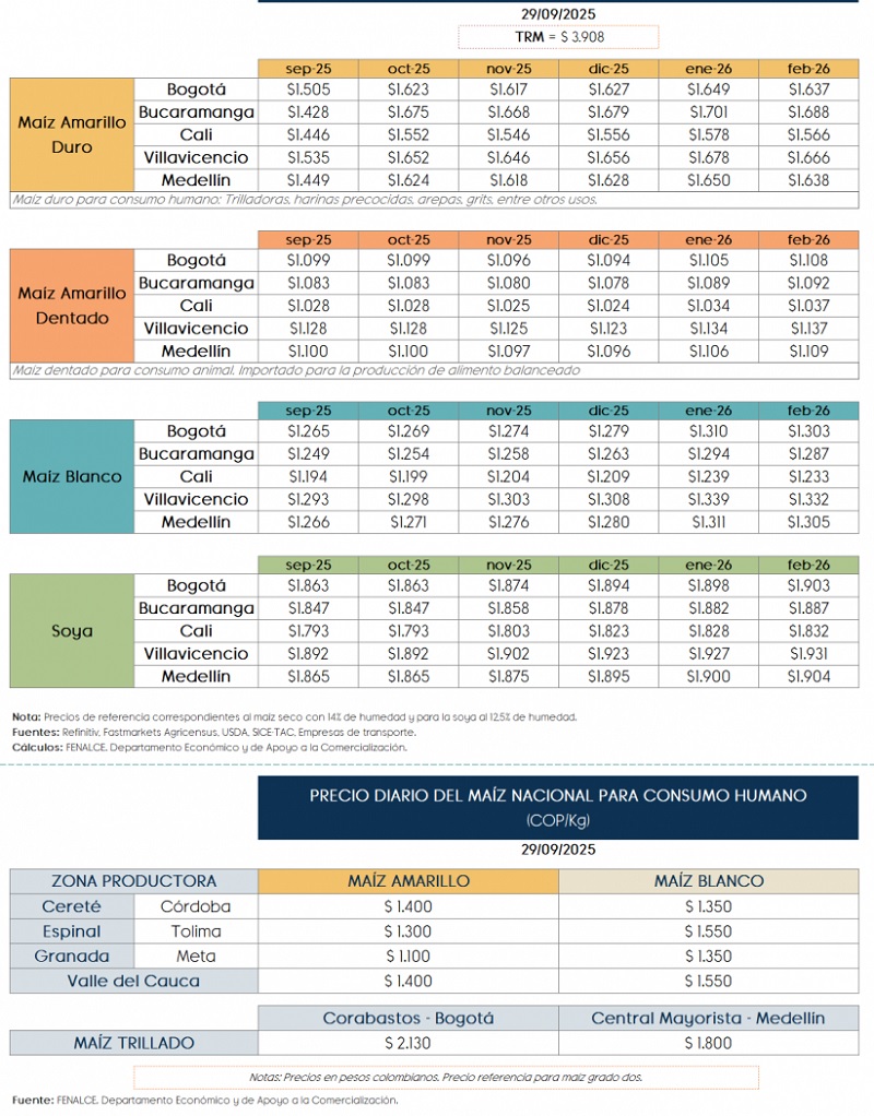 (Fenalce – Lunes 29 de septiembre de 2025).- A continuación encontrará los precios futuros de maíz y soya para Colombia. Estos son precios referencia no necesariamente son precios de compra. Los precios de cada comprador pueden variar al precio referencia dependiendo de condiciones pasadas, presentes y/o futuras del mercado internacional y/o nacional. Estos valores de se dan en pesos colombianos, de acuerdo con los precios de la Bolsa de Chicago y con la tasa de cambio del dólar americano de apertura de la jornada.