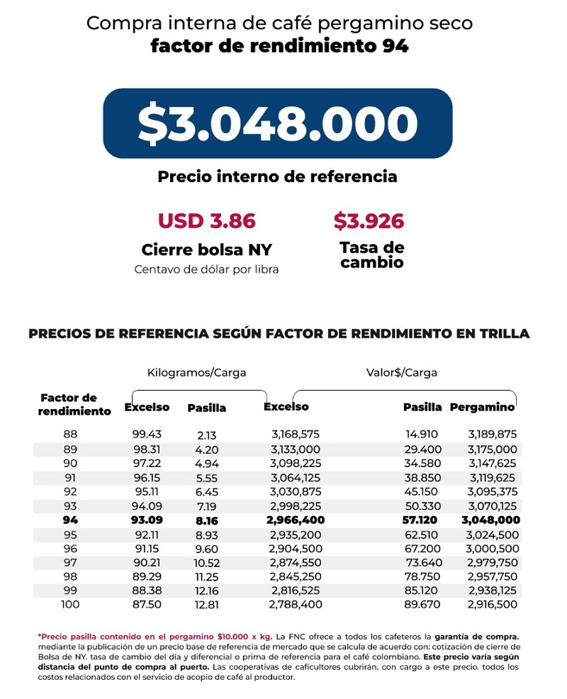 (FNC – Sábado 13 de septiembre de 2025).- La Federación Nacional de Cafeteros de Colombia (FNC) ofrece a todos los cafeteros la Garantía de Compra, mediante la publicación de un precio base de mercado que se calcula de acuerdo con la cotización de cierre en la Bolsa de Nueva York del día, el precio del dólar del día y el diferencial o prima de referencia para el café colombiano.