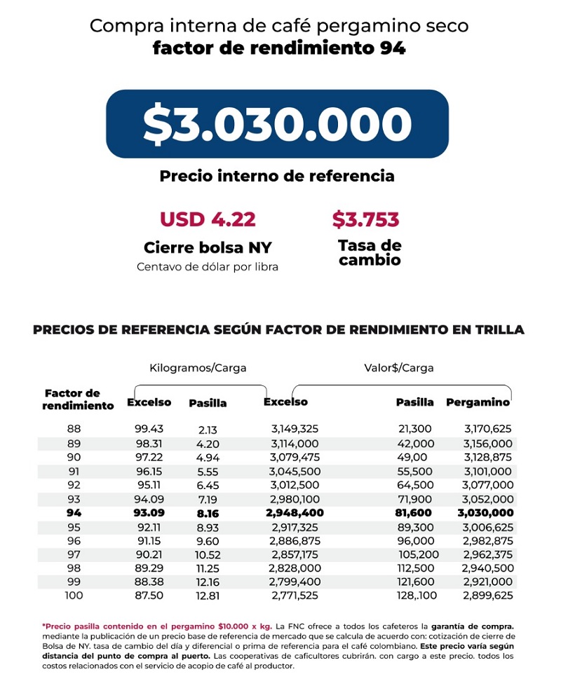 (FNC – Viernes 14 de noviembre de 2025).- La Federación Nacional de Cafeteros de Colombia (FNC) ofrece a todos los cafeteros la Garantía de Compra, mediante la publicación de un precio base de mercado que se calcula de acuerdo con la cotización de cierre en la Bolsa de Nueva York del día, el precio del dólar del día y el diferencial o prima de referencia para el café colombiano.