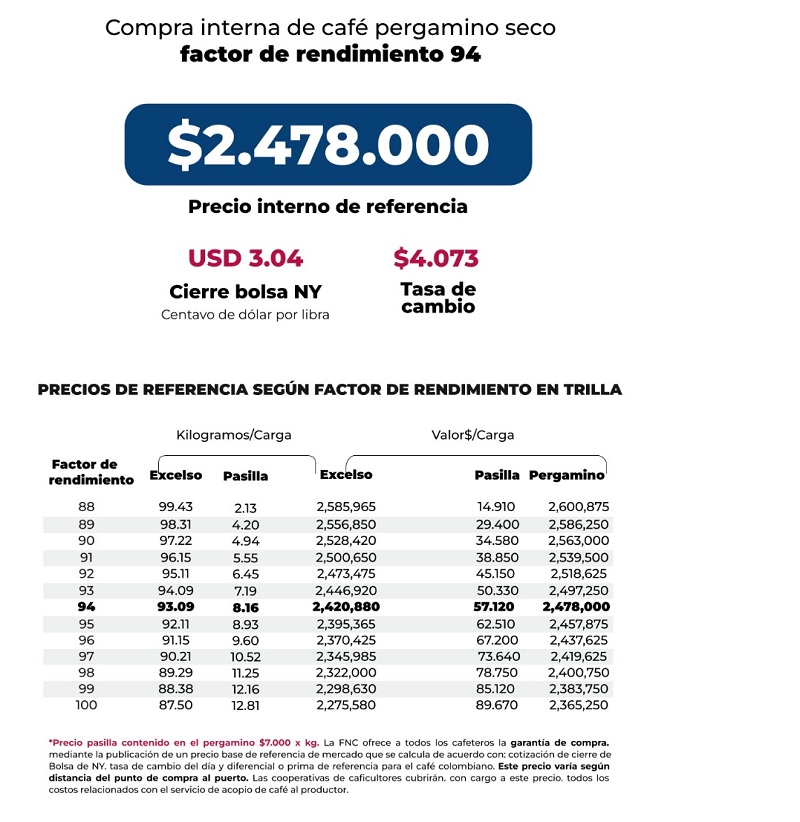 (FNC – Jueves 24 de julio de 2025).- La Federación Nacional de Cafeteros de Colombia (FNC) ofrece a todos los cafeteros la Garantía de Compra, mediante la publicación de un precio base de mercado que se calcula de acuerdo con la cotización de cierre en la Bolsa de Nueva York del día, el precio del dólar del día y el diferencial o prima de referencia para el café colombiano.