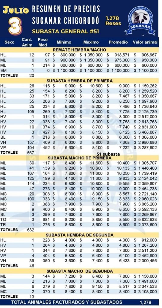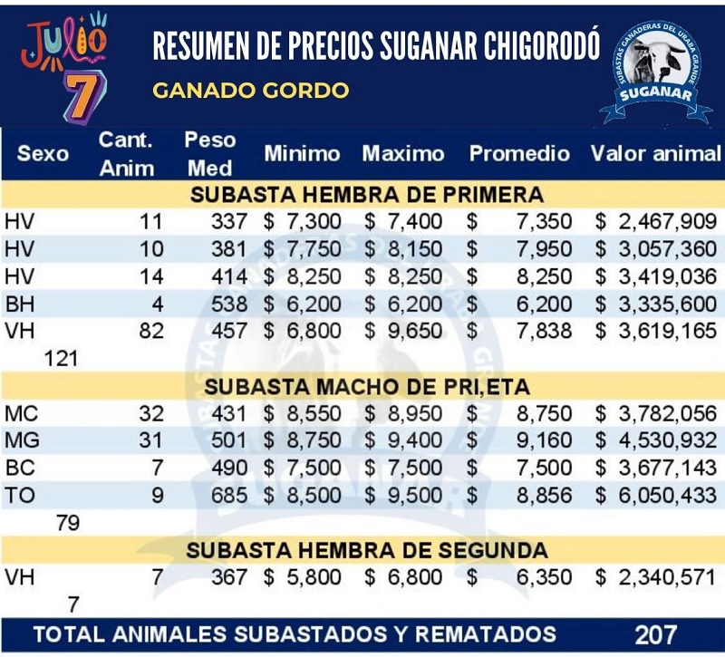 (Suganar – Martes 8 de julio de 2025).- Las Subastas Ganaderas del Urabá Grande (Suganar) presentan el resumen de precios por kilo del Ganado Gordo en Chigorodó (Uraba).