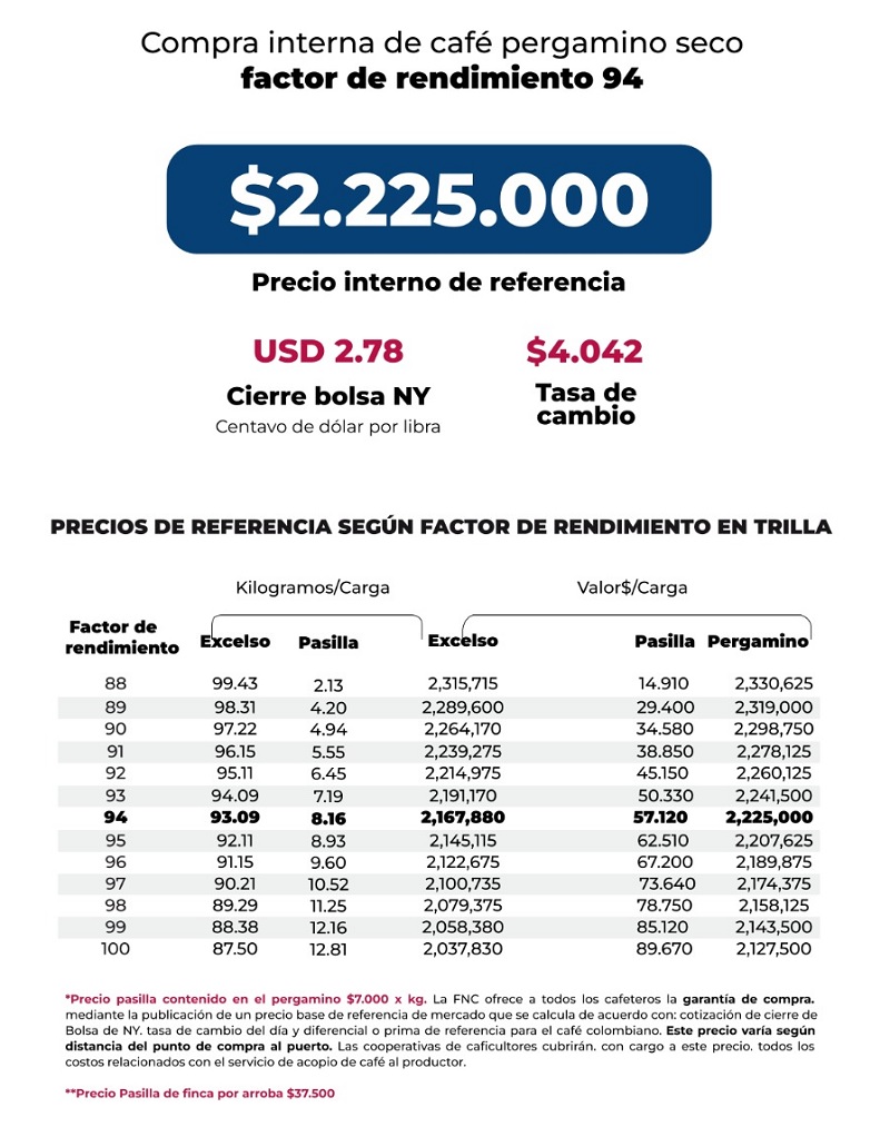 (FNC – Lunes 7 de julio de 2025).- La Federación Nacional de Cafeteros de Colombia (FNC) ofrece a todos los cafeteros la Garantía de Compra, mediante la publicación de un precio base de mercado que se calcula de acuerdo con la cotización de cierre en la Bolsa de Nueva York del día, el precio del dólar del día y el diferencial o prima de referencia para el café colombiano.