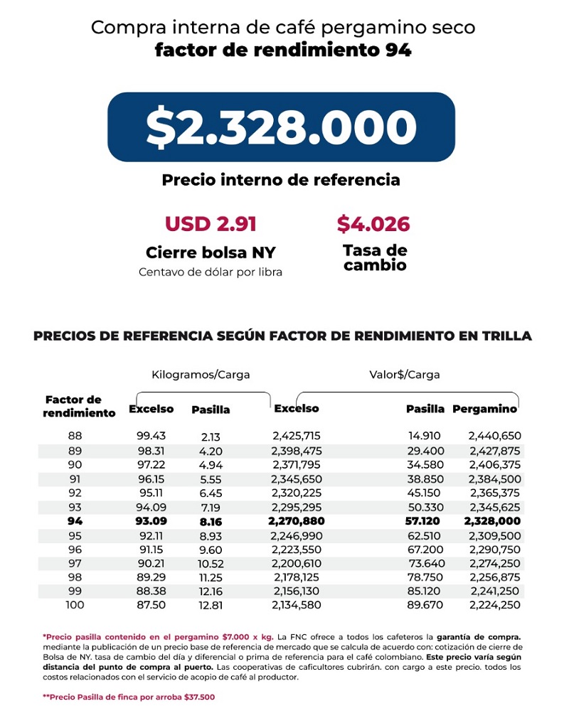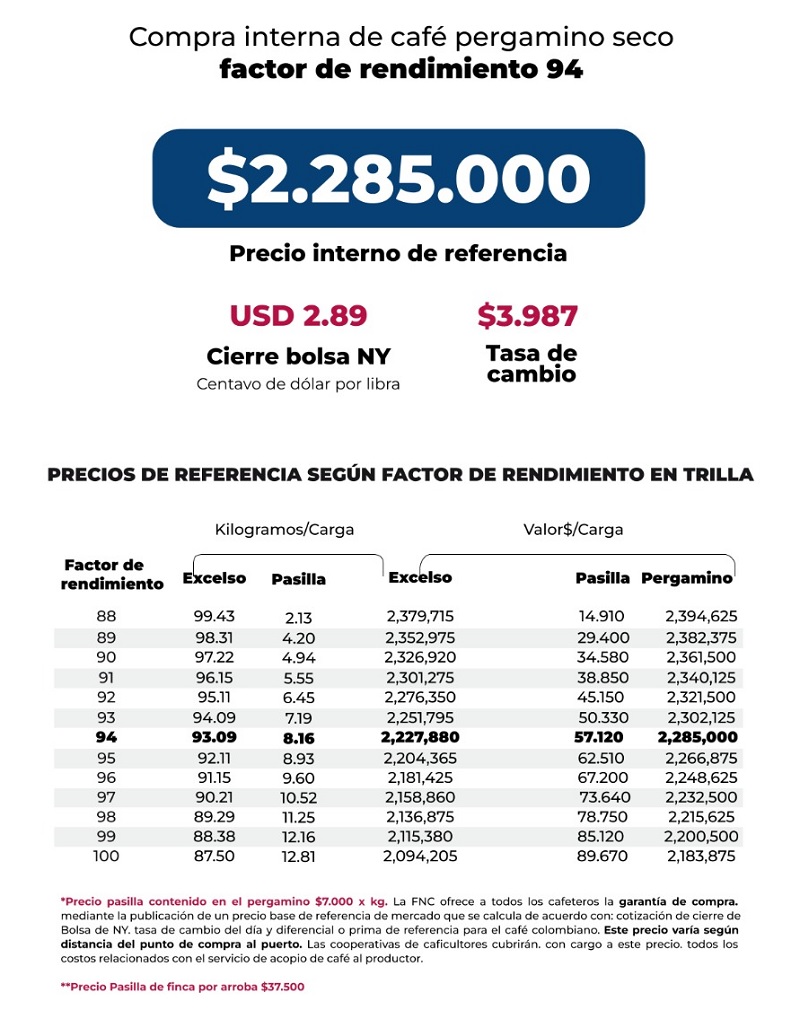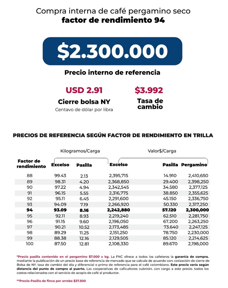 (FNC – Jueves 3 de julio de 2025).- La Federación Nacional de Cafeteros de Colombia (FNC) ofrece a todos los cafeteros la Garantía de Compra, mediante la publicación de un precio base de mercado que se calcula de acuerdo con la cotización de cierre en la Bolsa de Nueva York del día, el precio del dólar del día y el diferencial o prima de referencia para el café colombiano.